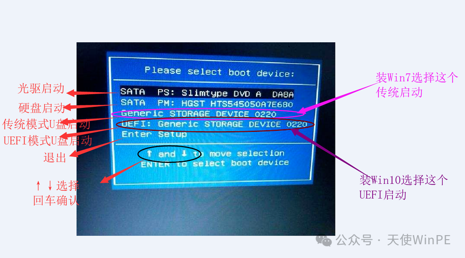 ​           Gener ic STORAGE DEVICE 0220 回车确认即为:传统模式启动【win7 及 winxp 选择项】